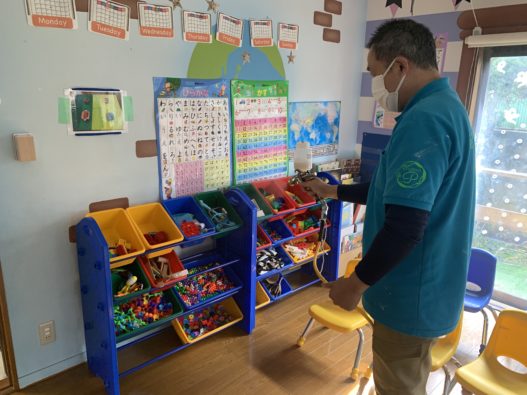 教室の子ども達が使用する遊具や机,イス。